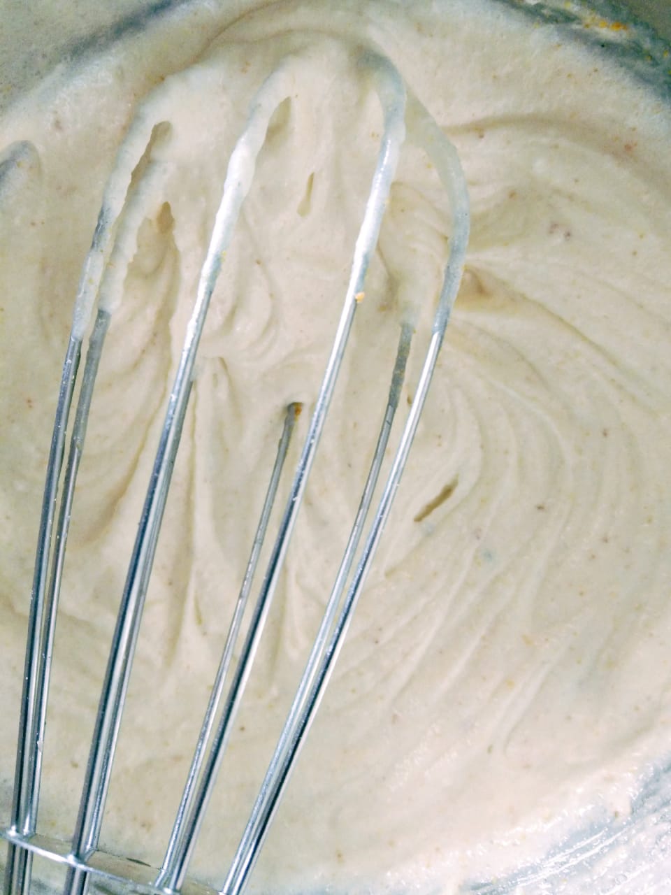 - In a bowl take the clarified butter and sugar and mix it using a spatula until it is light and creamy. Remember don’t beat it too much as the ghee becomes creamy easily and really fast.